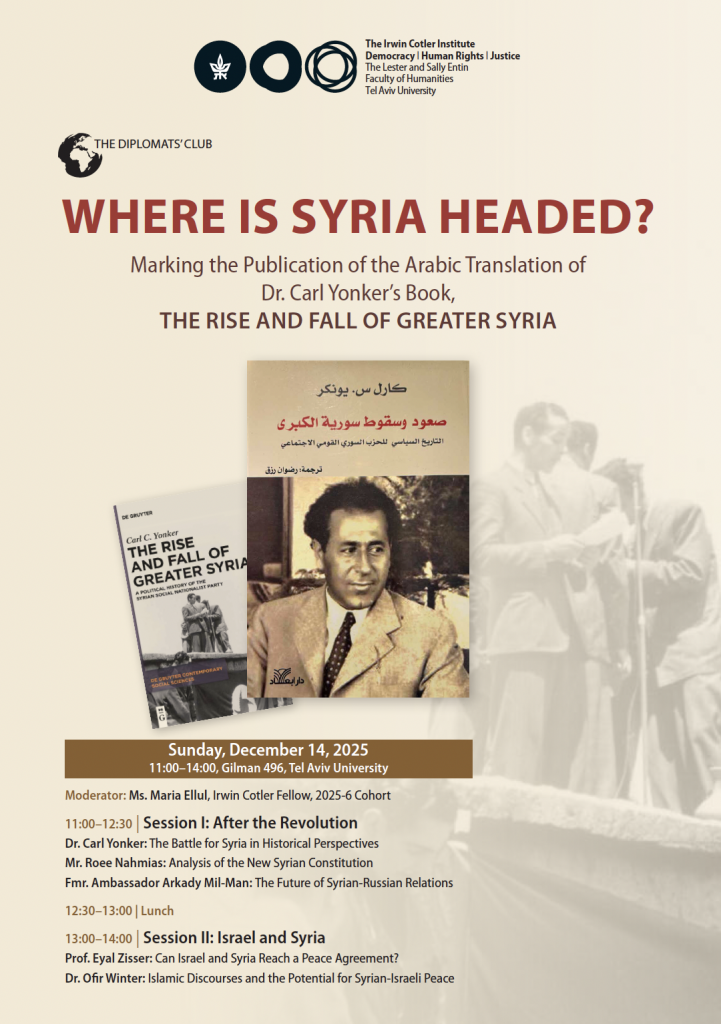 On Sunday, December 14, 2025, the Institute will host its first Diplomats’ Club of the academic year. The seminar will focus on current events in Syria following the overthrow of the Asad regime and marks the publication of the Arabic translation of Dr. Carl Yonker’s book, The Rise and Fall of Greater Syria.