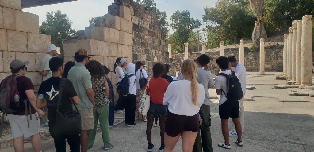 On November 2, the fourth cohort of Irwin Cotler Fellows embarked on their first field trip of the academic year to the magnificent ancient city of Beit She’an in Northern Israel. Located on the crossroads of the Via Maris trade route in the Jordan Valley, Beit She’an’s strategic location made it a thriving center of power and culture for millennia. A massive earthquake flattened most of the city in the 8th century, but thick layers of mud and silt covered and preserved archaeological wonders. Today, Beit She’an is home to the most marvelously excavated Roman ruins in Israel. Adriel Friedler (United States) commented that “it was immediately clear that Beit She’an is among the most breathtaking archaeological sites in the world. We could easily imagine its grandeur.”